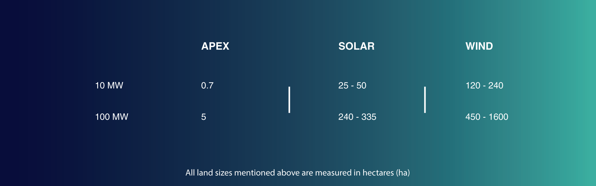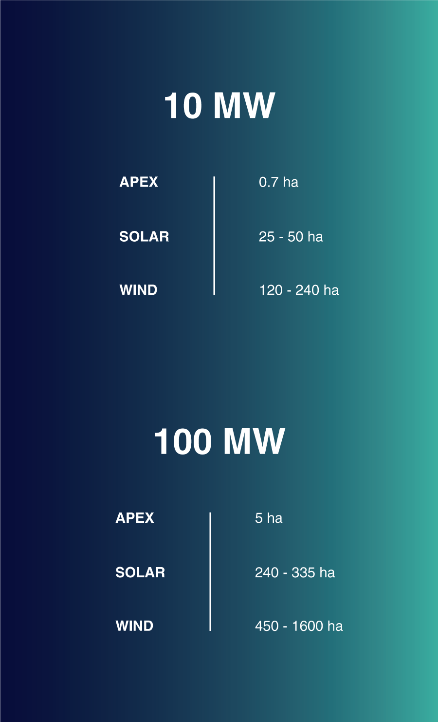 Minimal Land – The compactness of our units compares very favorably with other renewables, and the constancy of output means you don’t need to build in extra installed capacity, nor find additional space for storage. Traditional Solar panels require a large surface area and 4-6 times the stated capacity are needed to achieve the same kWh of the Apex, simply because of night-time, rainy/cloudy days and the inefficiencies of solar rays hitting the panels from different angles as the sun rises and falls.  Wind needs 3-4 times the required output due to variability in wind flows, and also requires massive amounts of turbine spacing, otherwise the turbines disrupt each other’s air flows.