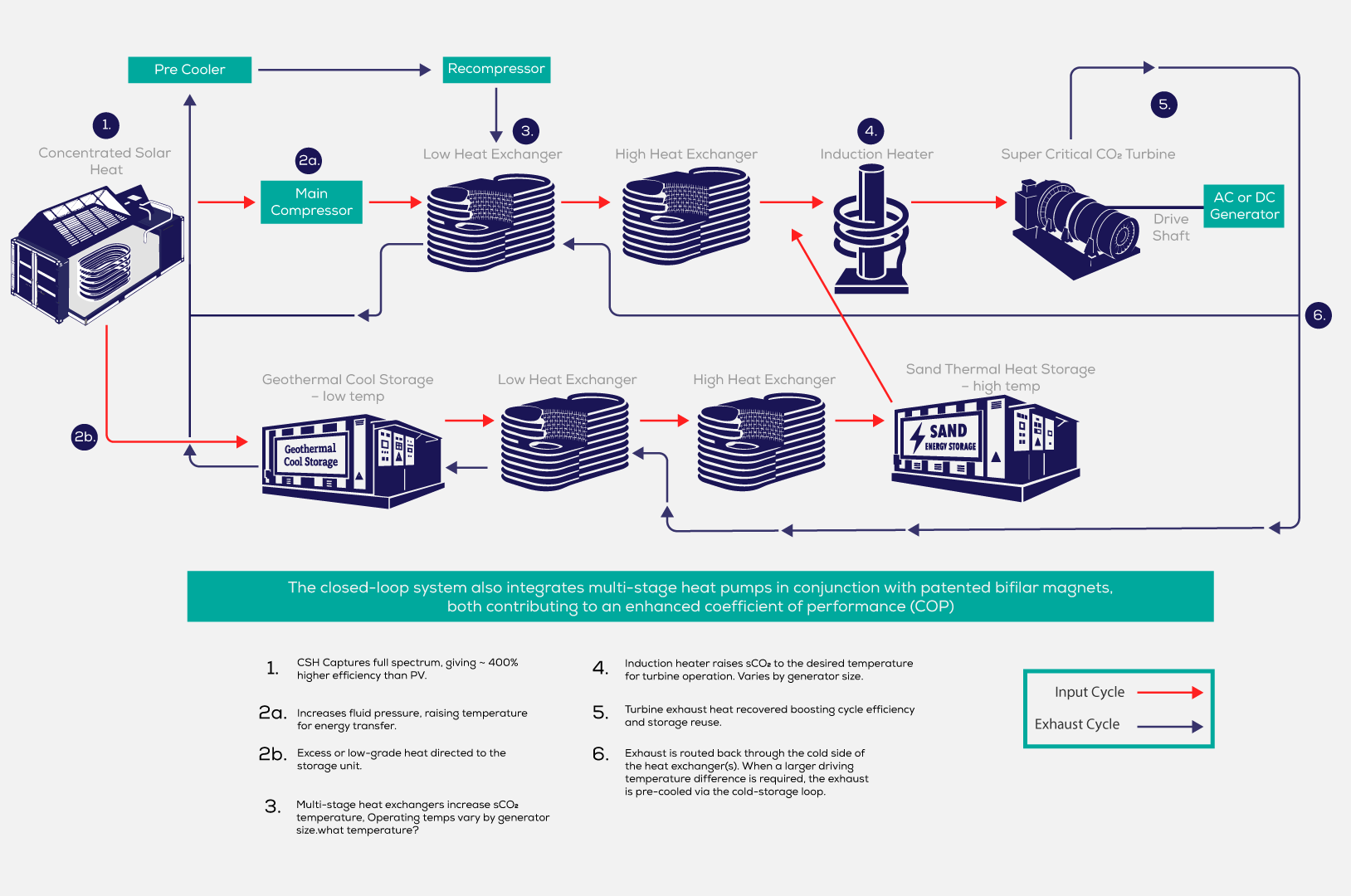 Turbine exhaust heat is recovered and routed to the cold side of the heat exchangers, supporting a regenerative cycle with a coefficient of performance COP of 6-10 (depending on conditions). The recovered thermal energy is either redirected to the Sand Box for storage or reintroduced into the working cycle, thereby improving system round-trip efficiency.